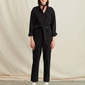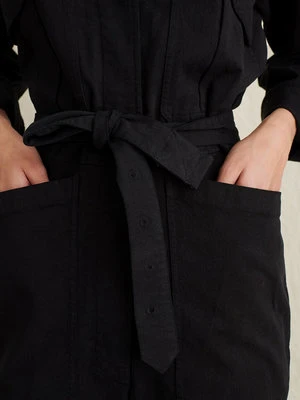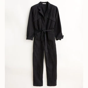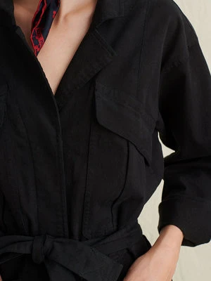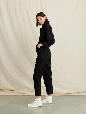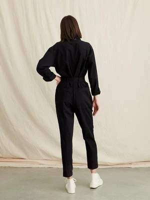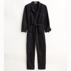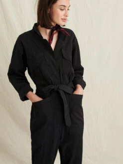 This jumpsuit is crafted from super-soft washed twill, and the fabric is brushed which makes it feel seriously great. With a heavier weight and a hint of stretch, it’s the perfect one-and-done piece for year-long wear. Other details to note: The self tie belt, patch front cargo pockets, back pockets and legs you can roll or leave straight. Size up if you’re between sizes as this is meant to be fitted.