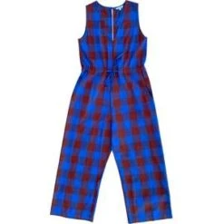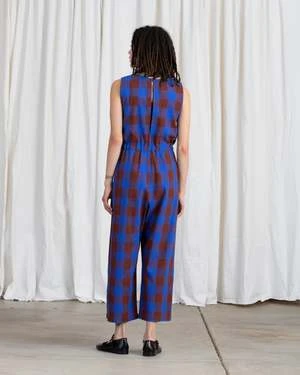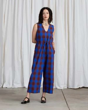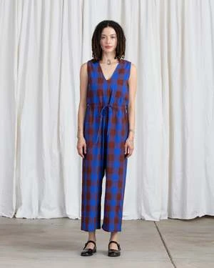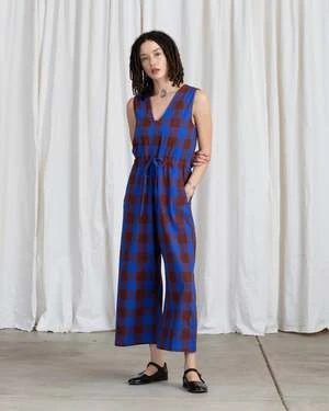 V-neck sleeveless jumpsuit with back slit opening, drawstring at waist, pockets and relaxed fit. Length hits above ankle.