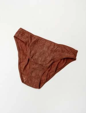 A classic bikini panty featuring elasticated edges, cut from sweet floral French lace that offers just the right amount of stretch, making for a comfortable wear and playful appearance in a rich honey brown.