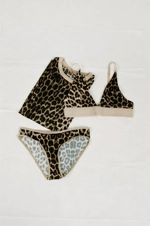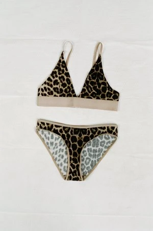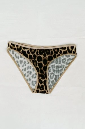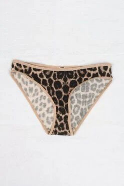 A pair of leopard print underpants with elastic trim at waist and leg.