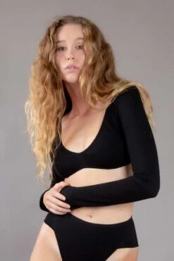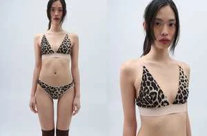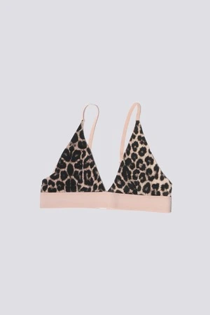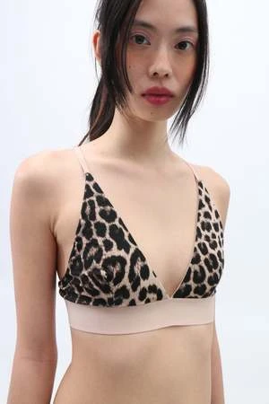 Triangle bra with darts at the chest for perfect coverage. Thin adjustable straps and thick elastic trim hem. Self-lined. Best suited for medium and small bust. Worn with matching Spring Leopard Bell Pant.