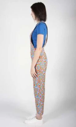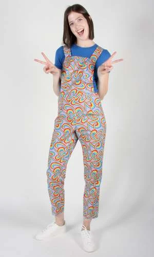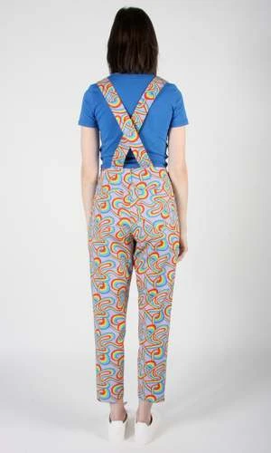 Bunting is a tailored cotton overall with crossed back straps, and both front and back pockets. It closes with a zipper at centre back. Shown here with the Canastero top in Cobalt.