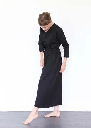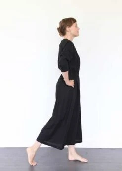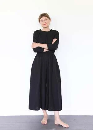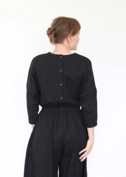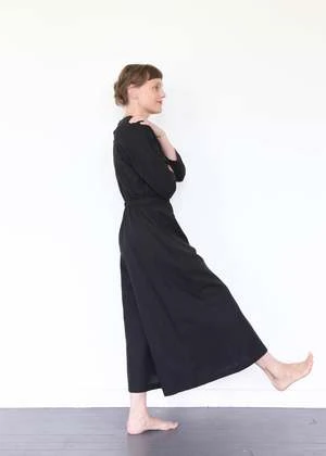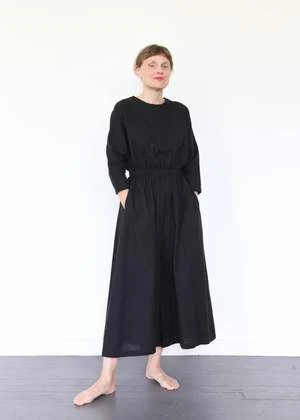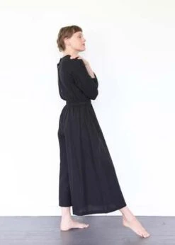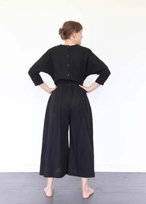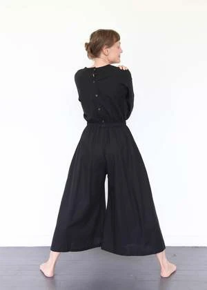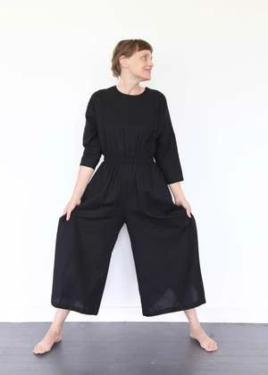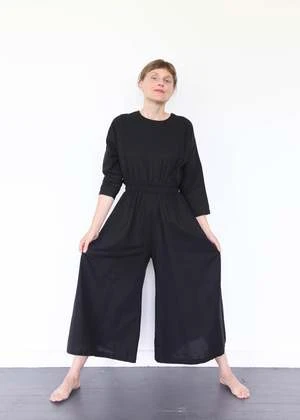 100% cotton twill jumpsuit with elastic waist, wide cropped legs, buttons down back. Made in USA