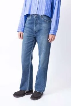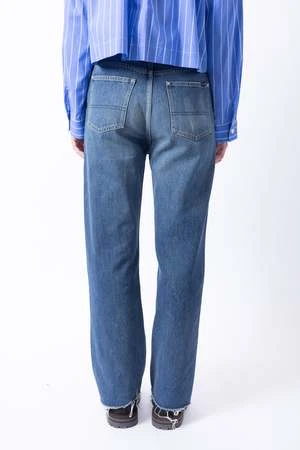 Subtly distressed and high waisted, this straight, medium wash denim pant includes raw-edge hems and soft fading at natural wear areas.