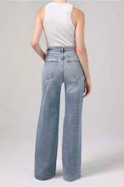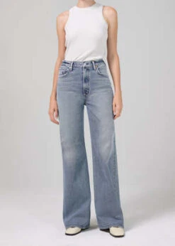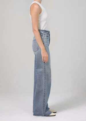 Citizens of Humanity Paloma wide leg baggy jean in mischief light blue indigo wash. Referencing baggy legged silhouettes from the early 2000s, the Paloma sits at the waist with vintage detailing and an easy flowing leg. Vintage medium indigo with a clean hem. Comfort stretch denim with a soft hand and vintage character. Zip fly.