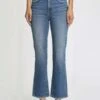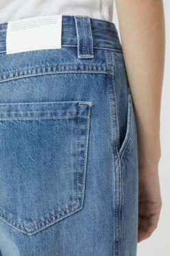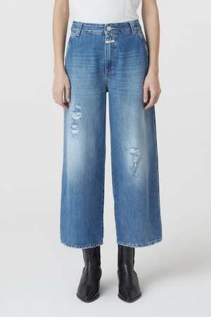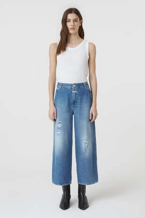 losed’s new Melfort jeans have a dramatic wide-leg silhouette that falls to cropped hems. Crafted from light-blue eco denim by Candiani that’s subtly whiskered and faded for a lived-in look, they sit high on the waist. Non-stretch, the denim made of pure organic cotton. Part of Closed’s sustainable denim line A BETTER BLUE.