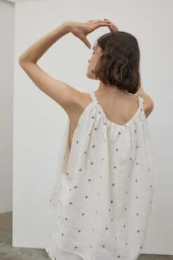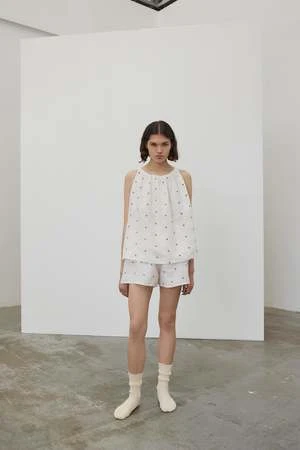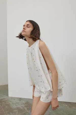 – the totem top features a high square shaped elastic neckline with a voluminous silhouette paired back with an elastic short with side seam pocket