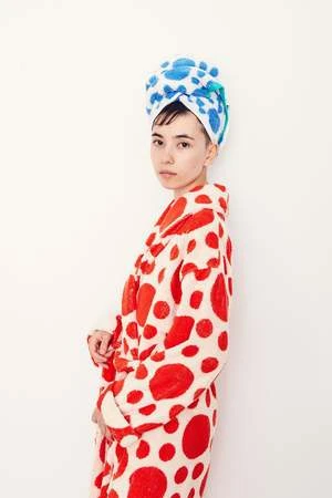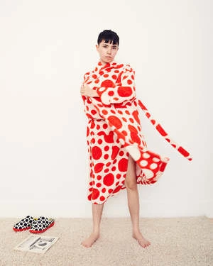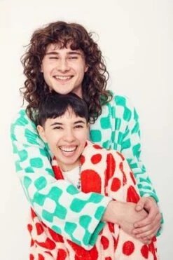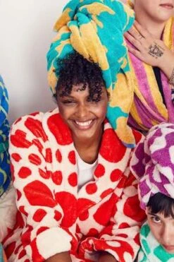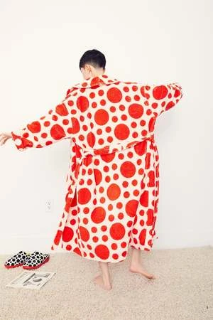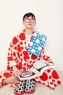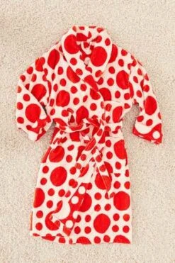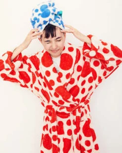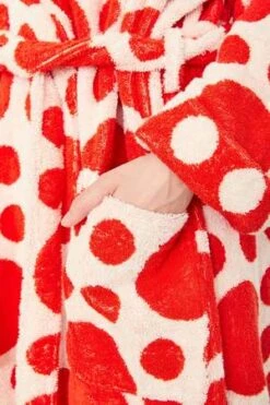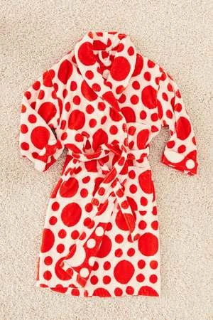 Bathrobe in Ring pattern. Cotton terry bathrobe with shawl collar, patch pockets, and tie in red and white Wingdings pattern. 100% cotton terry, 450 gsm. This item is Oeko-Tex Standard 100 certified (no harmful chemicals were used during its production). Made in Turkey.