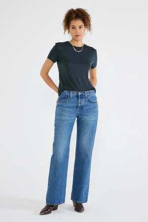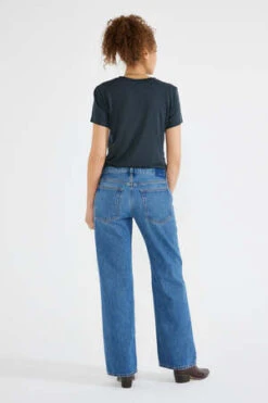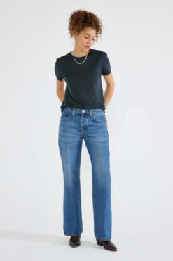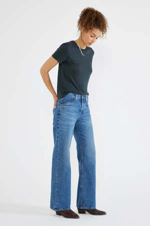 A modern bootcut with a relaxed fit, she sits comfortably low on the hip, with an easily flared leg. A chic medium wash with careful fading adds a bit of polish.