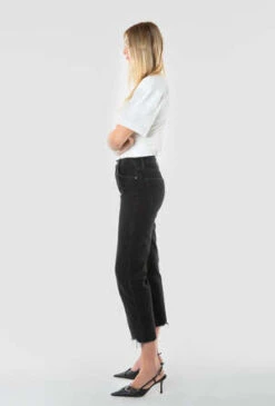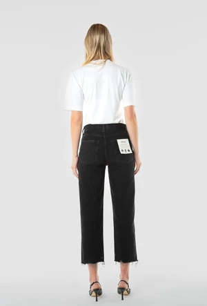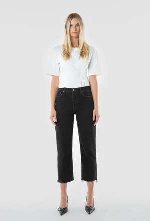 A high-rise straight with authentic vintage styling. Fitted through the hip, easy in the thigh, then straight down to a raw hem just above the ankle.