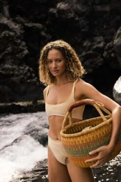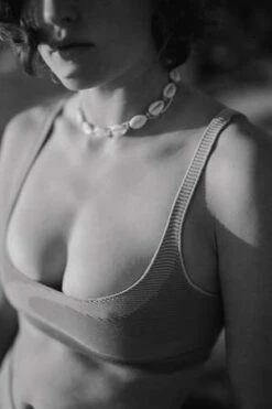 Scoop neck bikini top with 1″ wide straps and rib hem finish. 3D seamless knit design with custom two color wave knit pattern. Designed in Hawaii. Made in Brooklyn, N.Y. Learn more about our Brand and product here.