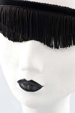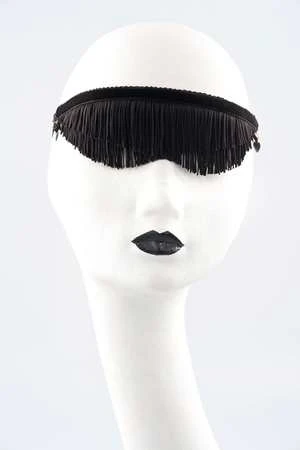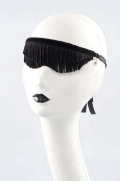 The Justine Blindfold, by Fraulein Kink, has layers of black fringe and velvet ribbon trim. Secure this blindfold with the double faced satin ribbon tie.