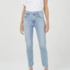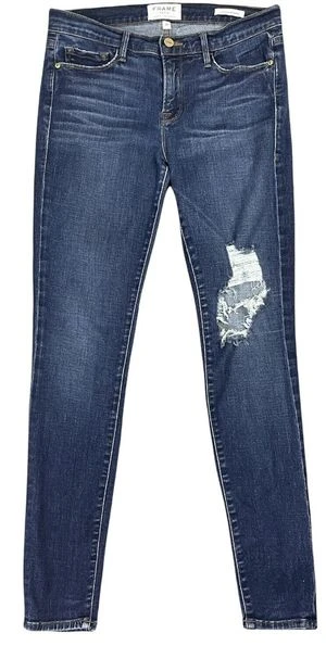 This Le Skinny de Jeanne by Frame Denim features supersoft and super-stretchy tech denim in a medium wash. Distressing at the knees adds edge to a classic pair.