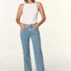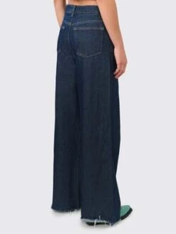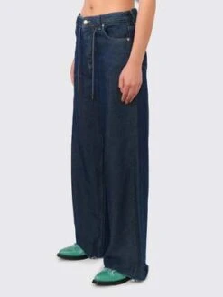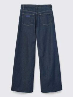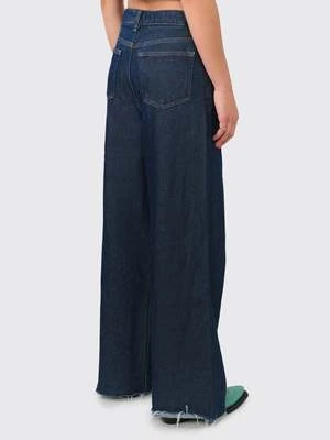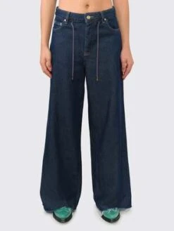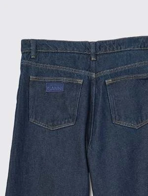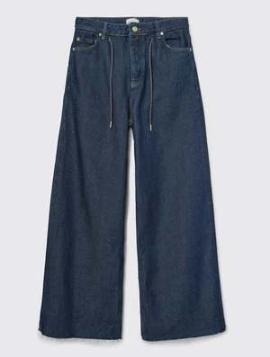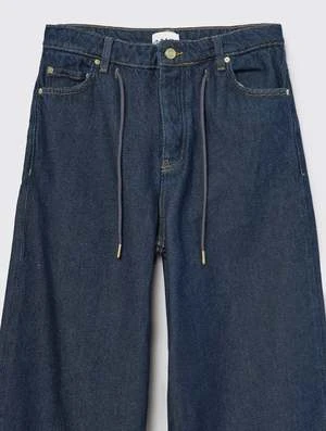 These organic cotton Heavy Denim Wide Drawstring Jeans offer a relaxed silhouette with a 5-pocket design, zip and button closure, belt loops, drawstring detail, and raw edges, complete with a GANNI logo at the back.
