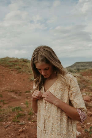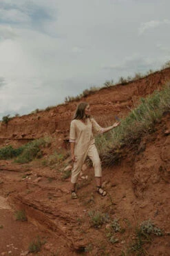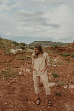 Victor Camel jumpsuit has been hand printed. Made from homespun, handwoven 100% cotton. Beachy, fresh, modern and sooo comfortable. We stick with our values focusing on color and texture with a sustainable product.
