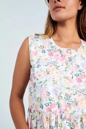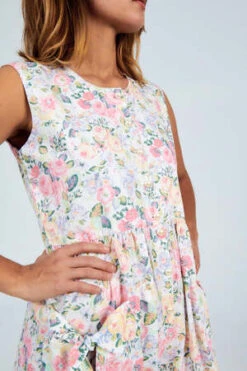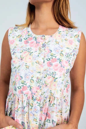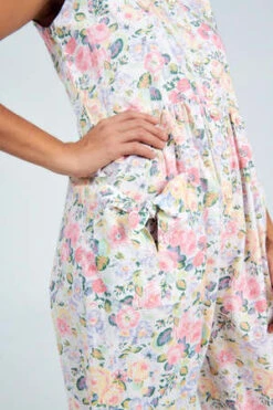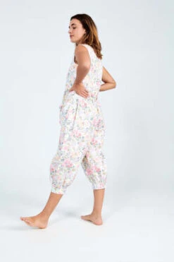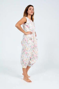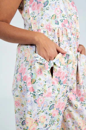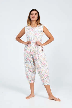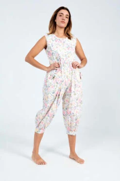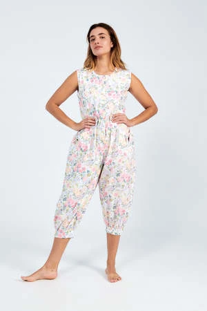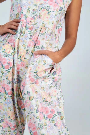 Sleeveless loose-fitting cotton jumpsuit in Laura Ashley’s archival Quartet Print based on a classic Laura Ashley silhouette. Pearl buttons down the front. Tie pockets in front. Ankle length.