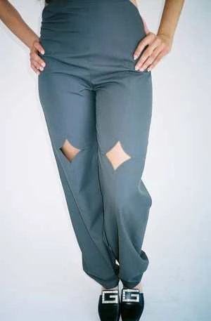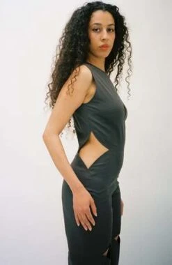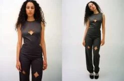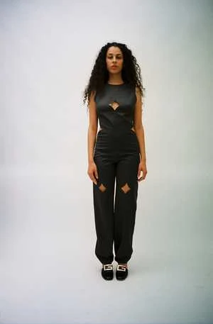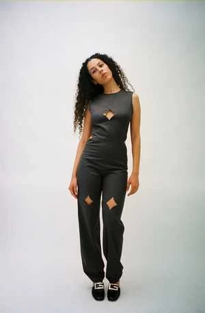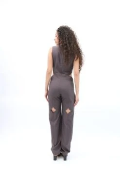 The brown lattice jumpsuit is crafted from a stretch wool-blend twill fabric, adorned with graphic cutouts throughout, creating a bold and contemporary look. It features a round neck and a concealed zip closure at the back, ensuring a sleek and seamless silhouette.