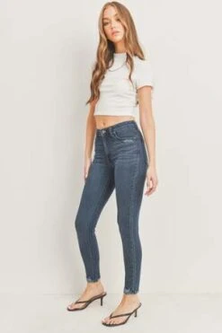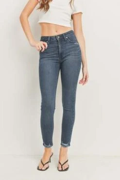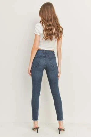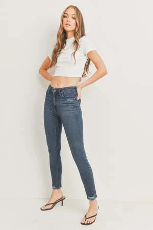 A standard high-rise skinny thats more than meets the eye. Comfortable and classy, this pair features raw hems and light distressing around the waist.