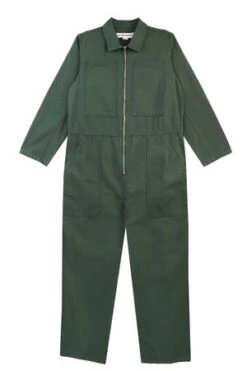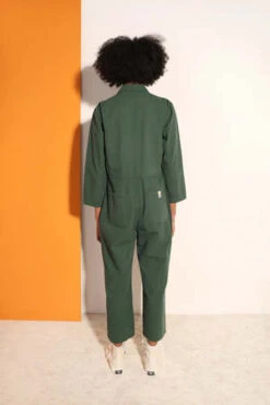The Dominic Boilersuit has a relaxed fit and a slightly tapered leg. With 3/4 length sleeves. In forest green cotton canvas, with large utility style pockets and contrast stitching throughout, and a silver front zip.