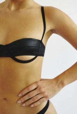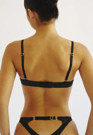 Balconette underwire bra, made of soft and heavy polyamide, gives a leather effect., has an opening in the lower cup that exposes the skin. Adjustable straps and gold-plated accessories, three-position back fastening. Angela wears size S