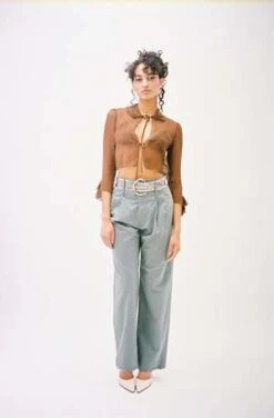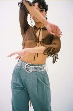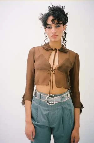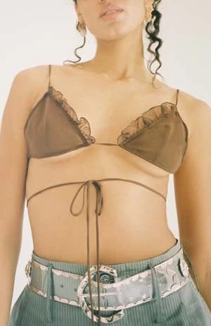 Exclusive color to Maimoun. Semi-sheer bra with ruffled edging in brown. Thin adjustable straps and long wrap-around ties. Worn with matching Wren Blouse, Elise Belt and Tidal Abdou Trouser.