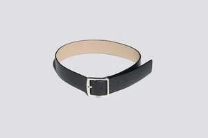 Black leather belt. Features a square silver metal buckle. A beautiful piece to cinch a dress or wear with a suit pant.