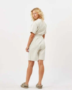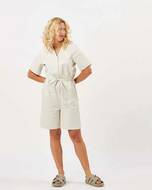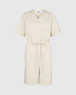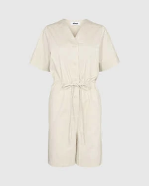 A jumpsuit crafted from organic cotton and elastane for a comfortable and stretchy quality. The jumpsuit has a relaxed fit and features v-neck, a tie string at the waist, a chest pocket and short wide sleeves. The model is 178 cm tall and wears a size 36.