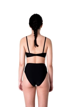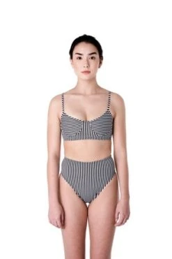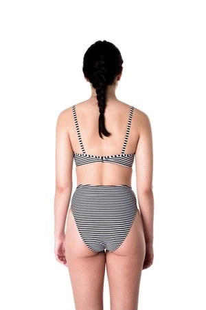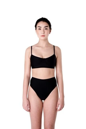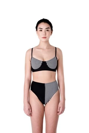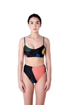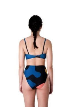 The Shell top is a bralette style top with a metal closure in the back. Shown here with the Bronze bottoms. Available in our Dada print, black, and Dada/black.