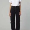 – Raw hem; Lightly distressed throughout