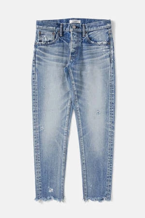 – Light wash mid-rise tapered jean