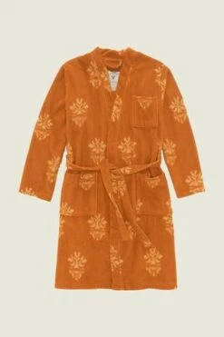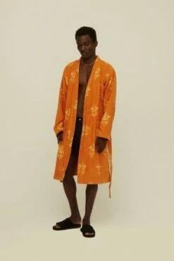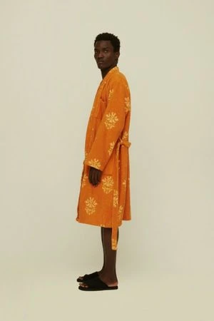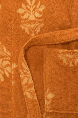With a tangerine and dainty damask-style emblem pattern, the Your Highness bathrobe is one made for royalty. The knee-length, wrap-style robe is crafted in 100% Jacquard-woven terry cotton that lets your body breathe. With a generous fit, the robe is perfect for throwing on when exiting the sea.