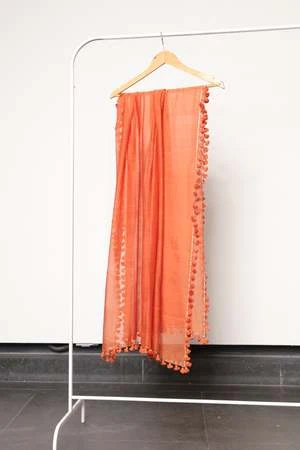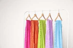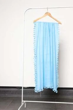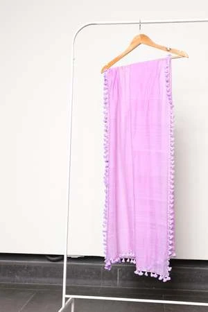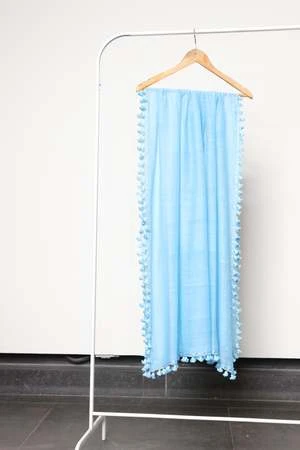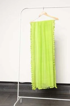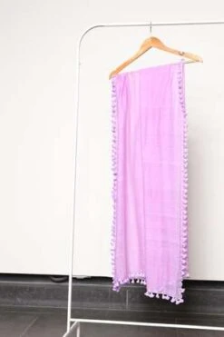 Pom Pom Sarong Scarf. Soft and sheer handloomed fabric, featuring a metallic border and all over pom pom detailing. Wear it as a sarong for a beach day or style it as a scarf with your outfit!