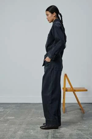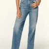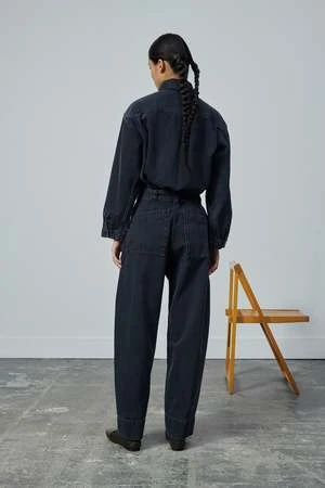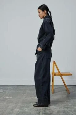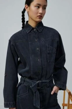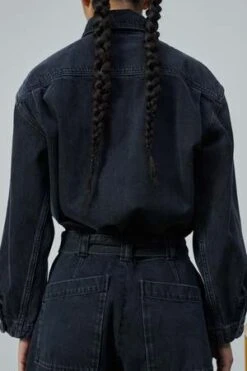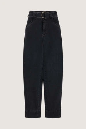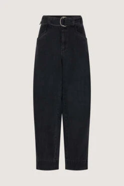 High waisted belted jeans from Soeur in faded black denim with a slightly rounded cut and a removable double buckle belt. Two patch pockets on the back and detailed cutaway pockets in the front.