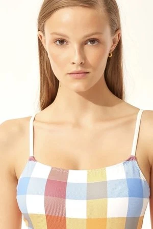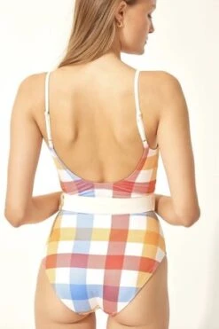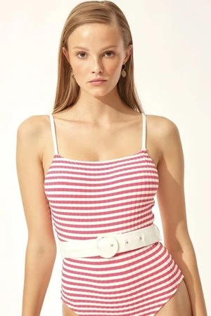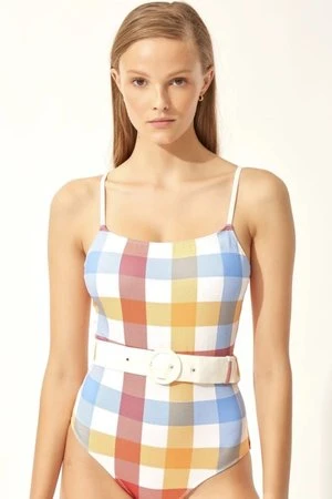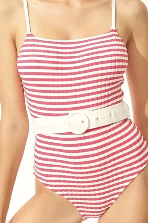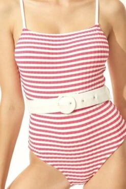 The Nina features a leotard silhouette with a classic neckline and spaghetti straps. Ribbed fabric and waist defining belt make this suit super flattering for all shapes.