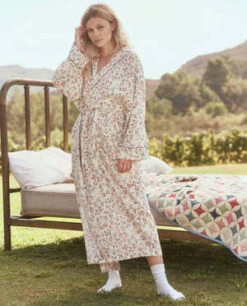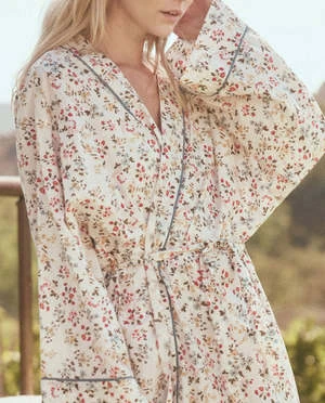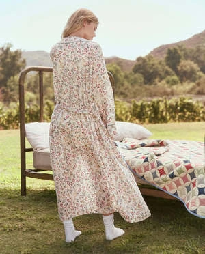 The Robe in Terrace Floral by The Great. is a vintage-inspired loungewear staple featuring an oversized fit with voluminous sleeves, contrast piping, and secure waist ties.
