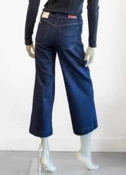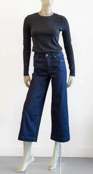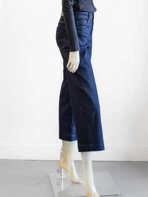 Customer favorite high-rise cropped wide leg pant in a dark denim wash. Hugging at your waist and hips, our comfort stretch twill gives just the right amount of movement. Featuring double sew on buttons, zip fly closure and tonal stitching.