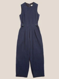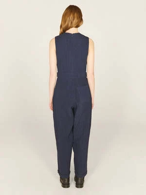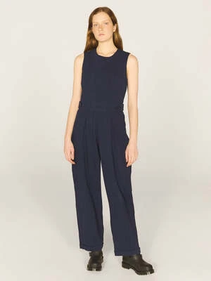 The Jojo Seersucker Jumpsuit in Indigo from YMC is a sleeveless jumpsuit cut from a heavy duty cotton seersucker. Featuring front waist pleats and side pockets. Crafted from cotton seersucker, the jumpsuit has invisible zip fastening at the back and side pockets.